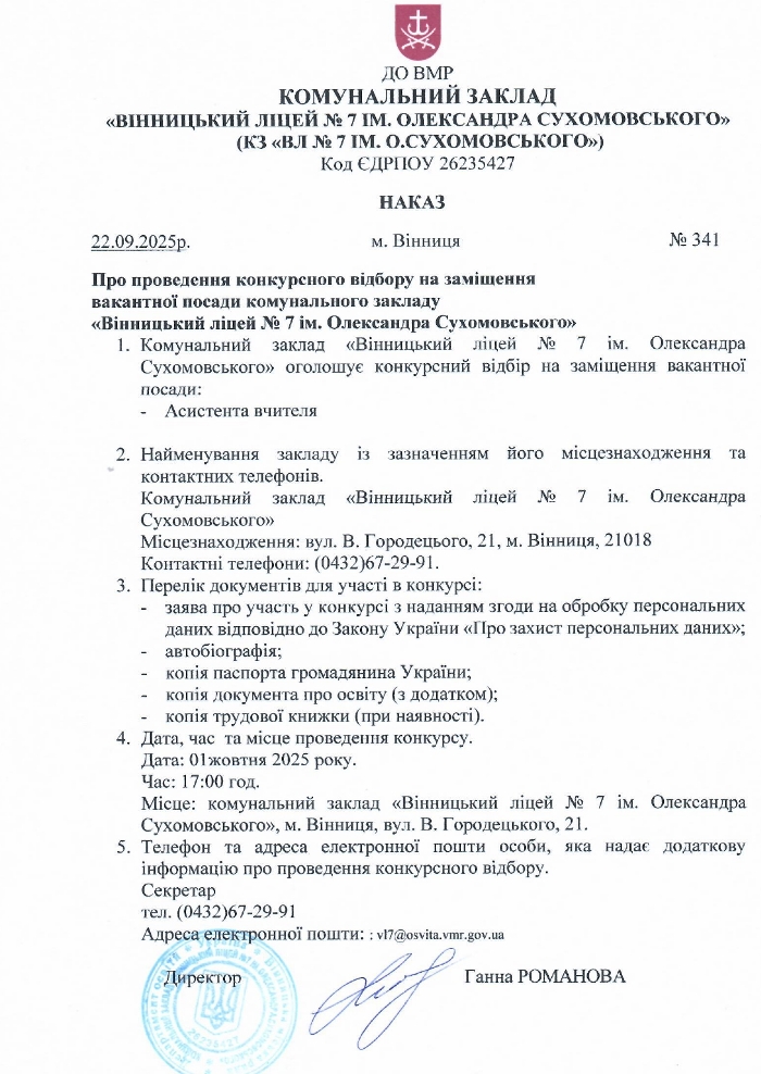 - бібліотекар 0.5 ставки.